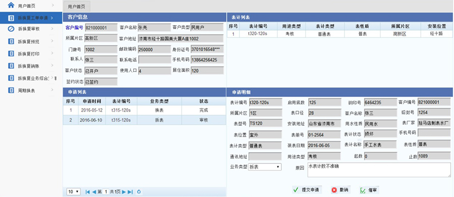 針對在冊水表,管理從水表購買、安裝、使用至水表報廢的生命周期過程,實(shí)現(xiàn)水表檔案的維護(hù)、水表的拆換復(fù)購檢等操作以及水表庫存管理等功能;對水表因故障或周期強(qiáng)檢換表等進(jìn)行分析和統(tǒng)計(jì),靈活查詢水表在線狀態(tài);主要功能包括水表檢定管理、出入庫管理及拆換復(fù)管理;所有管理流程生成工單可發(fā)送到手機(jī)端。